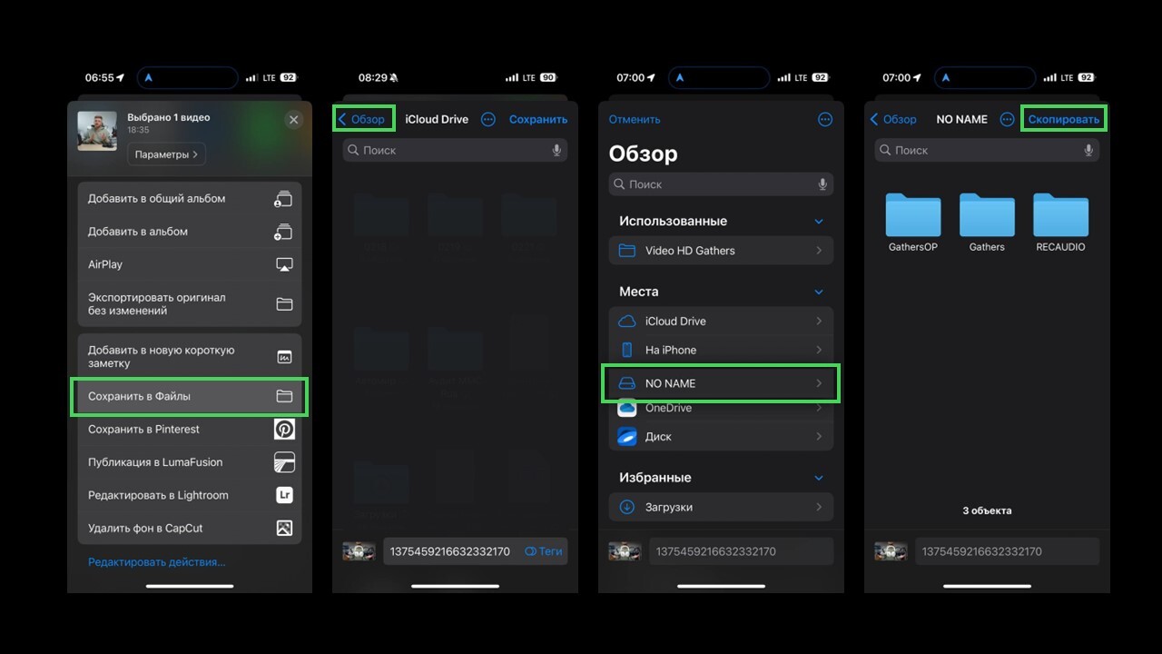 - Заходим в галерею iPhone. выбираем видео, нажимаем Поделиться - Сохранить в Файлы