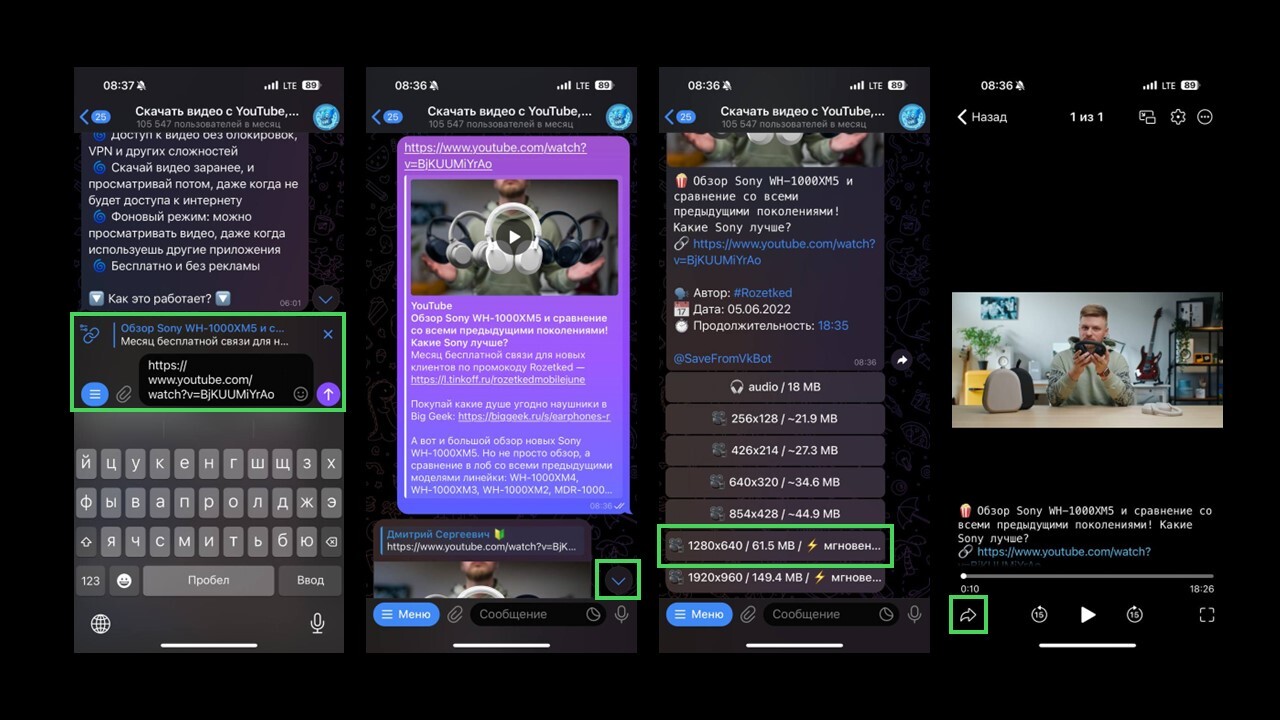 Начнём с поиска интересующего нас видео. Я решил взять в качестве примера, обзор наушников от SONY. Заходим на YouTube, копируем ссылку и вставляем в бот. Бот предлагает нам выбор разрешения видео: